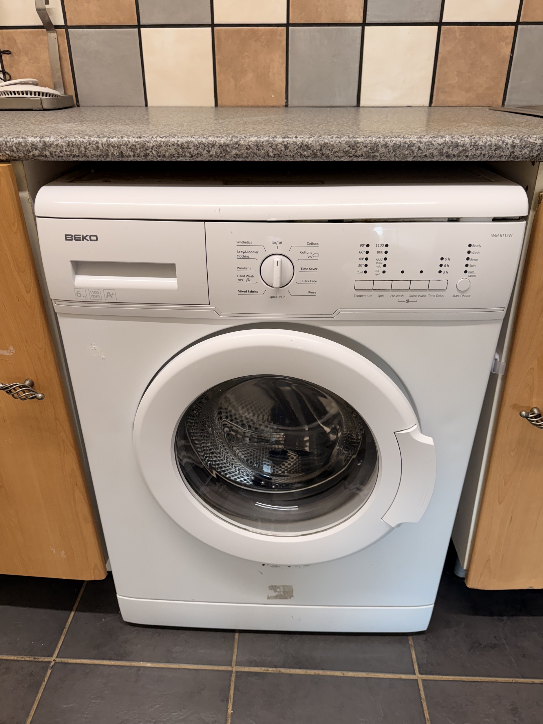 The modern kitchen/Breakfast room is well-equipped with a freestanding electric cooker, full-height fridge/freezer, washing machine, and contemporary beechwood effect units with a tiled splashback.