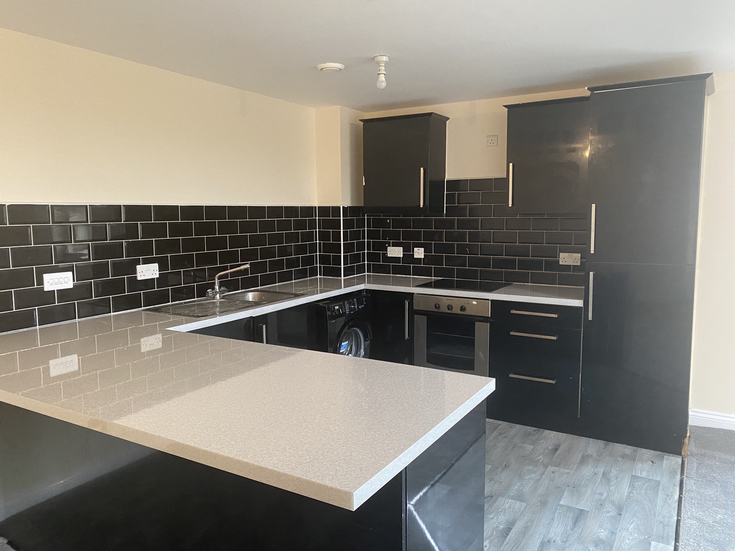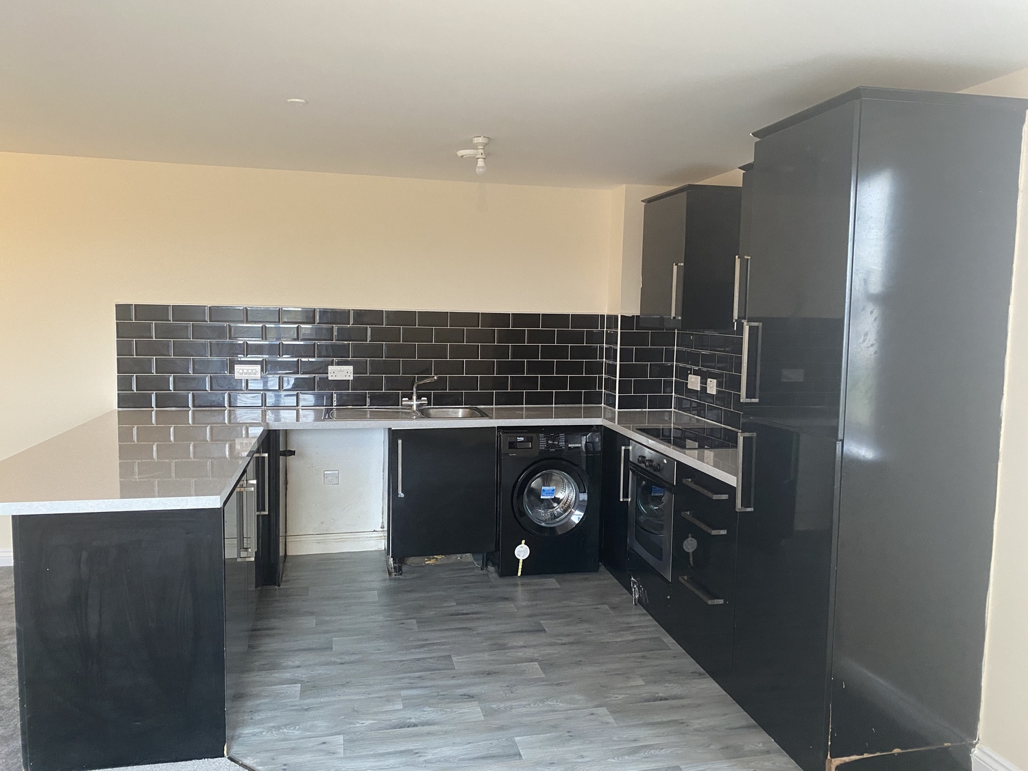 Contemporary open-plan living with combined lounge/dining area/kitchen. Modern black gloss kitchen units with stylish sparkle high gloss work surface. Electric oven and electric Hob, integrated full size fridge/freezer and washing machine.